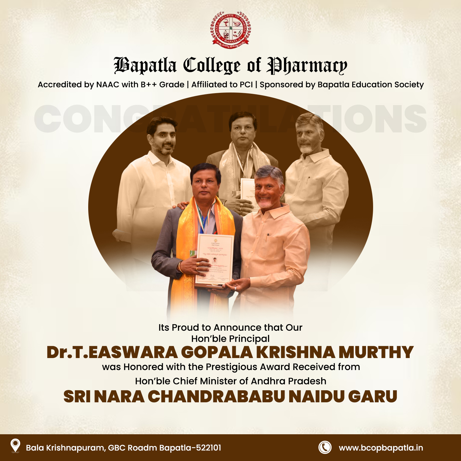 The Bapatla College of Pharmacy is one of first private pharmacy colleges established in the year 1995. It is located on a 55-acre campus in Bapatla, the fast growing town and is very well known as education hub because of wide number of renowned schools and colleges of which Acharya N.G. Ranga Agricultural College and the College of Agricultural Engineering , college of food science and technology, Bapatla Public School, Bapatla Engineering College, Bapatla Polytechnic college etc. are some of the most prestigious institutions . The campus incorporates large areas of grass malls with well-lighted, tree-lined paths. The College is easily accessible by road from Bapatla town, providing 50,000 square feet of state-of-the-art teaching and laboratory facilities. Additionally, the pharmacy college houses a pilot plant of APOGEN Remedies (A pharmaceutical Drug Manufacturer) and CPCSEA approved animal house facility.