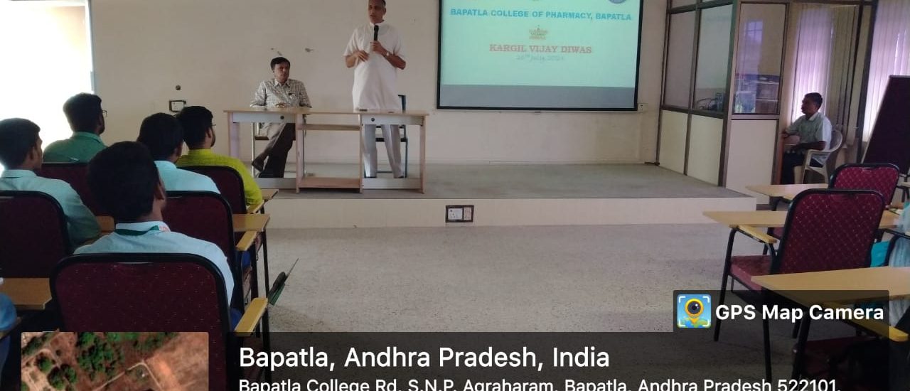 Bapatla College of Pharmacy Principal Acharya Gopala Krishna Murthy stated in the Kargil Vijay Divas program held at the college that the sacrifice of immortal heroes cannot be forgotten. Mr. Janardhan, who was the chief guest of the program, said that Kargil Vijay Divas is celebrated every year on July 26 to commemorate the successful end of the Kargil War on July 26, 1999. Bapatla Education Society President Shri Muppalaneni Srinivasa Rao, Secretary Shri Manam Nageswara Rao, Vice President Shri D Rammohan Rao, Shri G Dilip Kumar, Joint Secretary Shri K Hari Padma Prasad, Treasurer Shri T Ramakrishna felicitated the organizers.